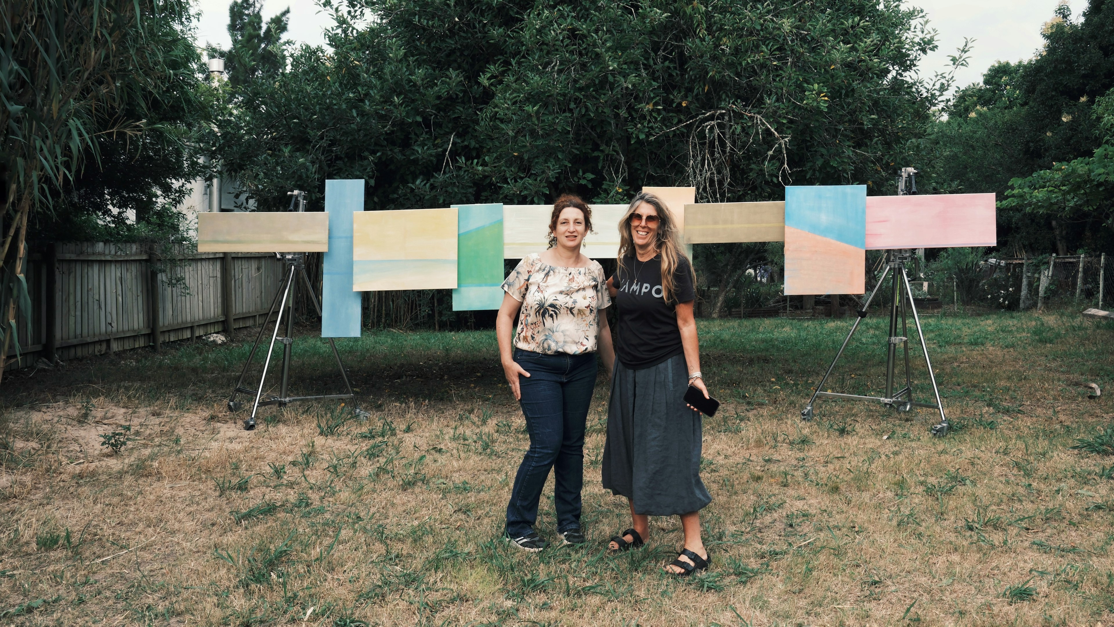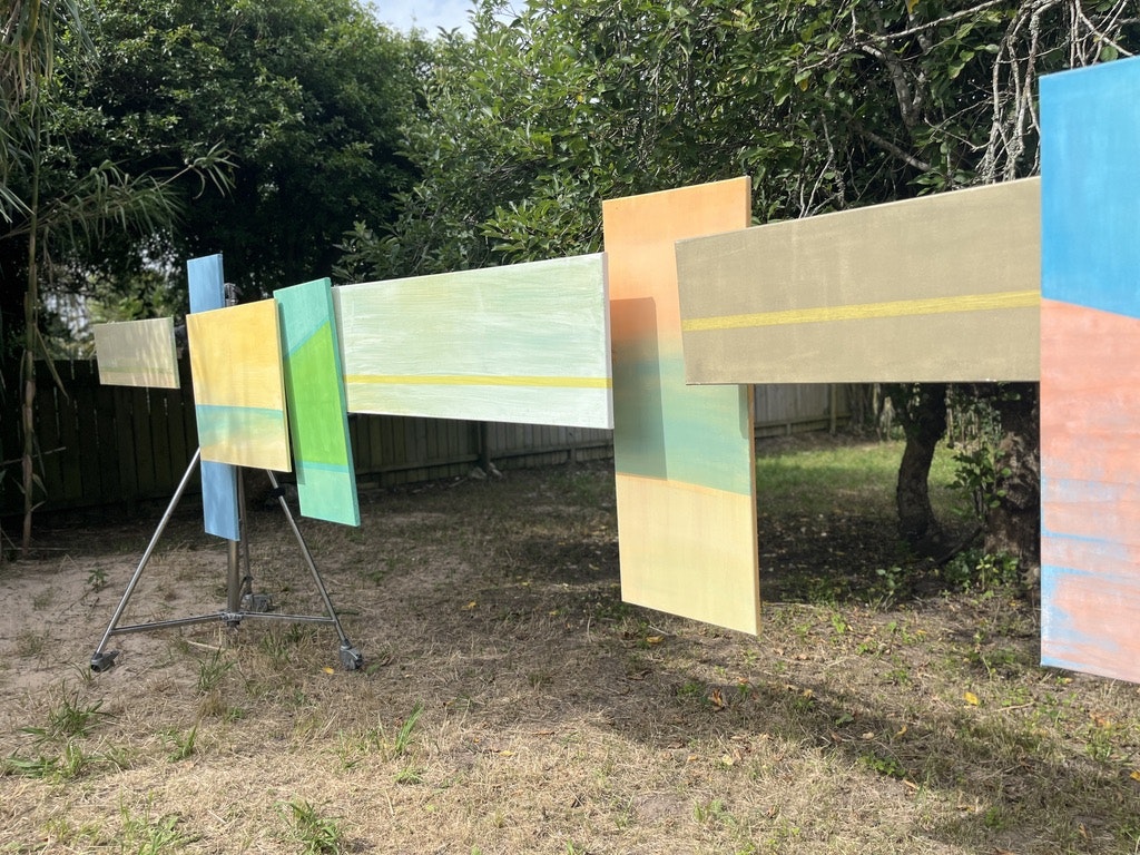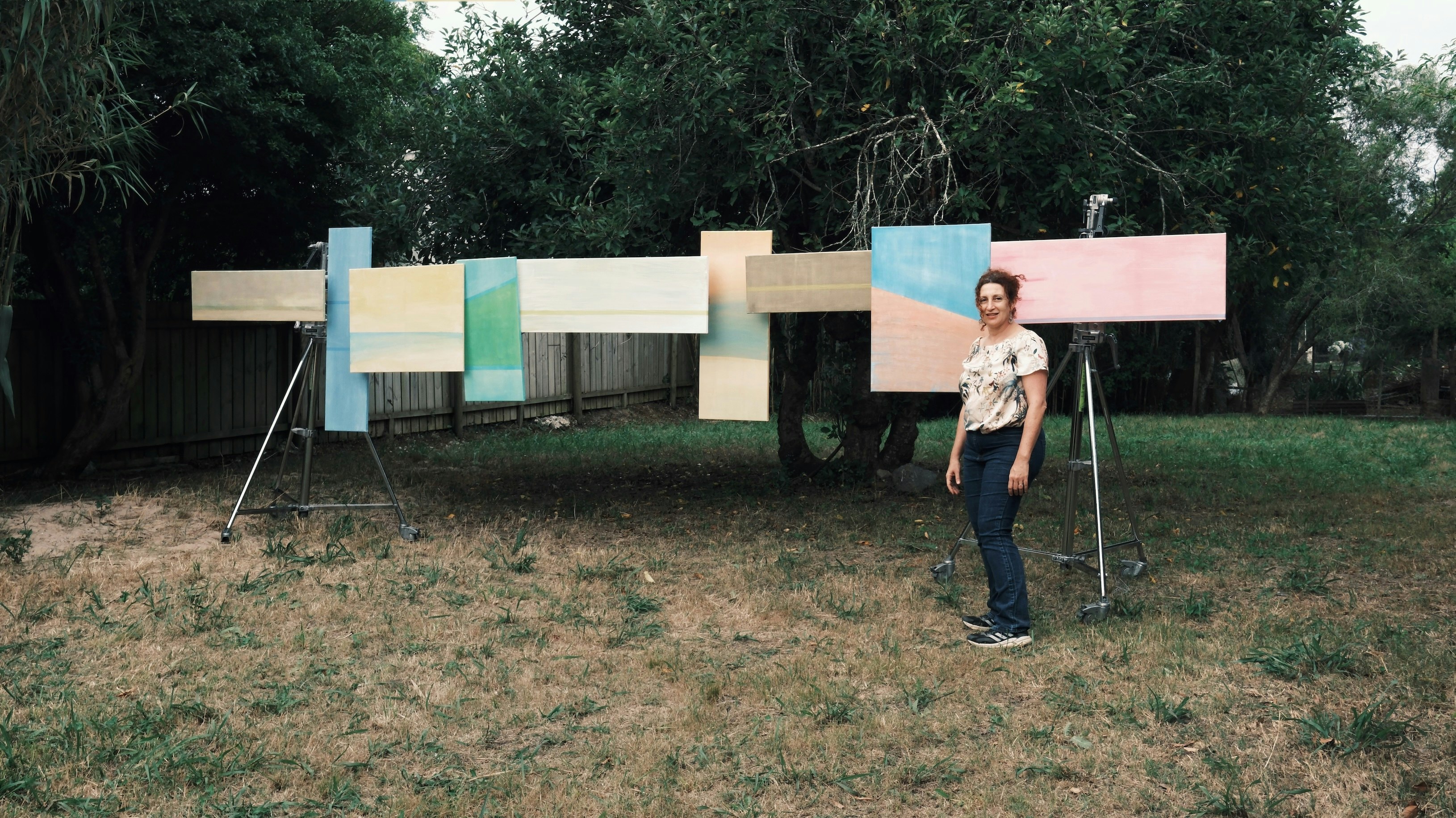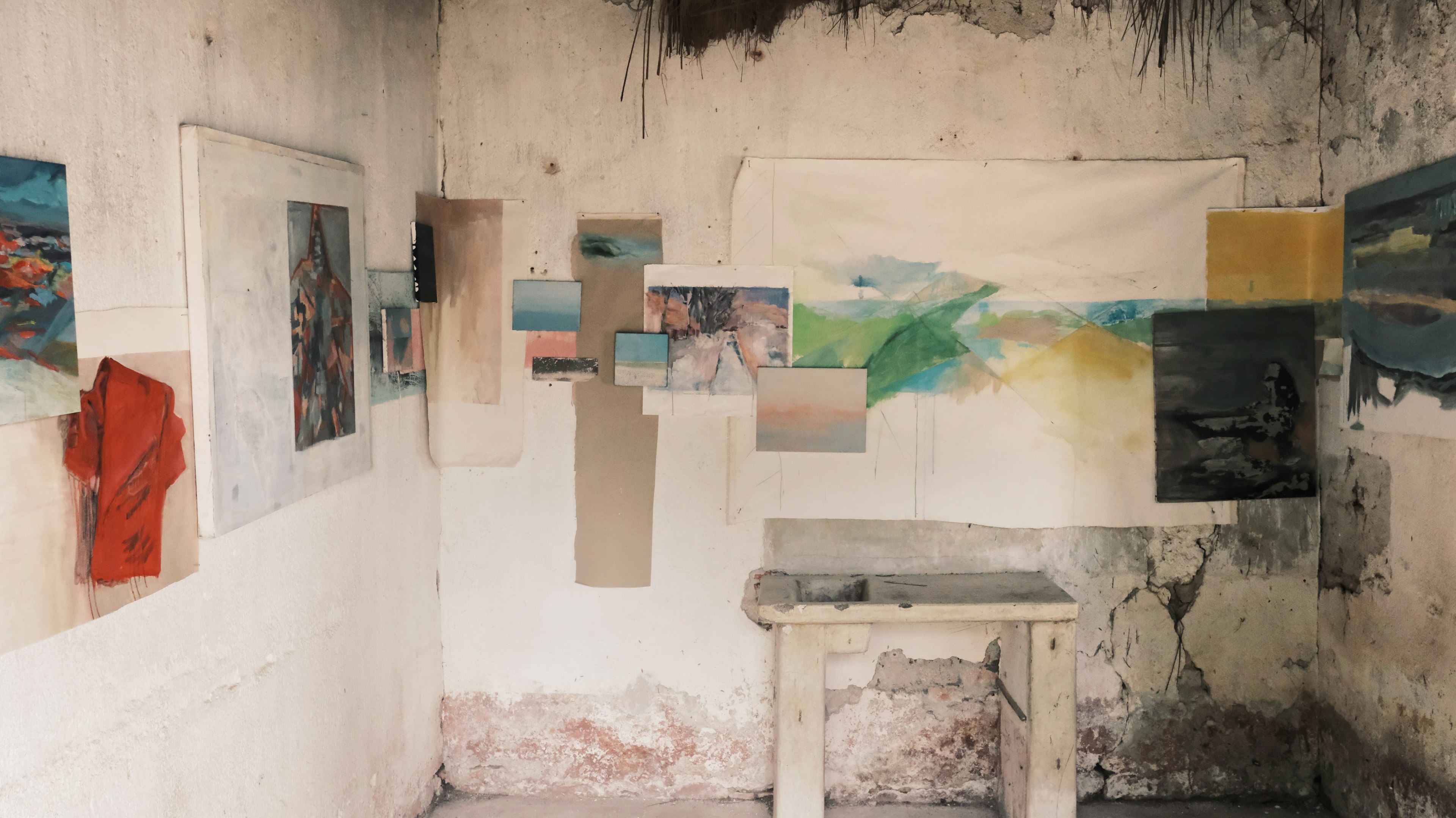 En esta instancia ocupé la parte de adentro de una tapera y el jardín con mi obra Horizons, una instalación pictórica que crea un paisaje de horizontes que desdibujan los límites del viaje migratorio entre pasado y futuro, familiar y desconocido.